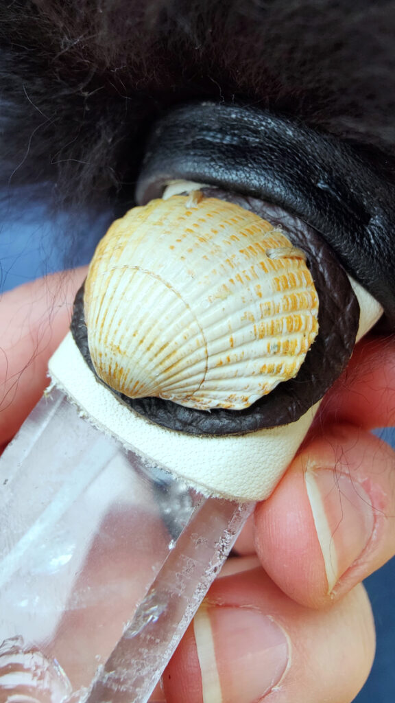 Der Griff trägt eine wasserklar schimmernde Bergkristallspitze, verziert mit einer Muschel, die Linda ebenfalls selbst gefunden hat, ist eine Verbindung von Erde und Wasser.