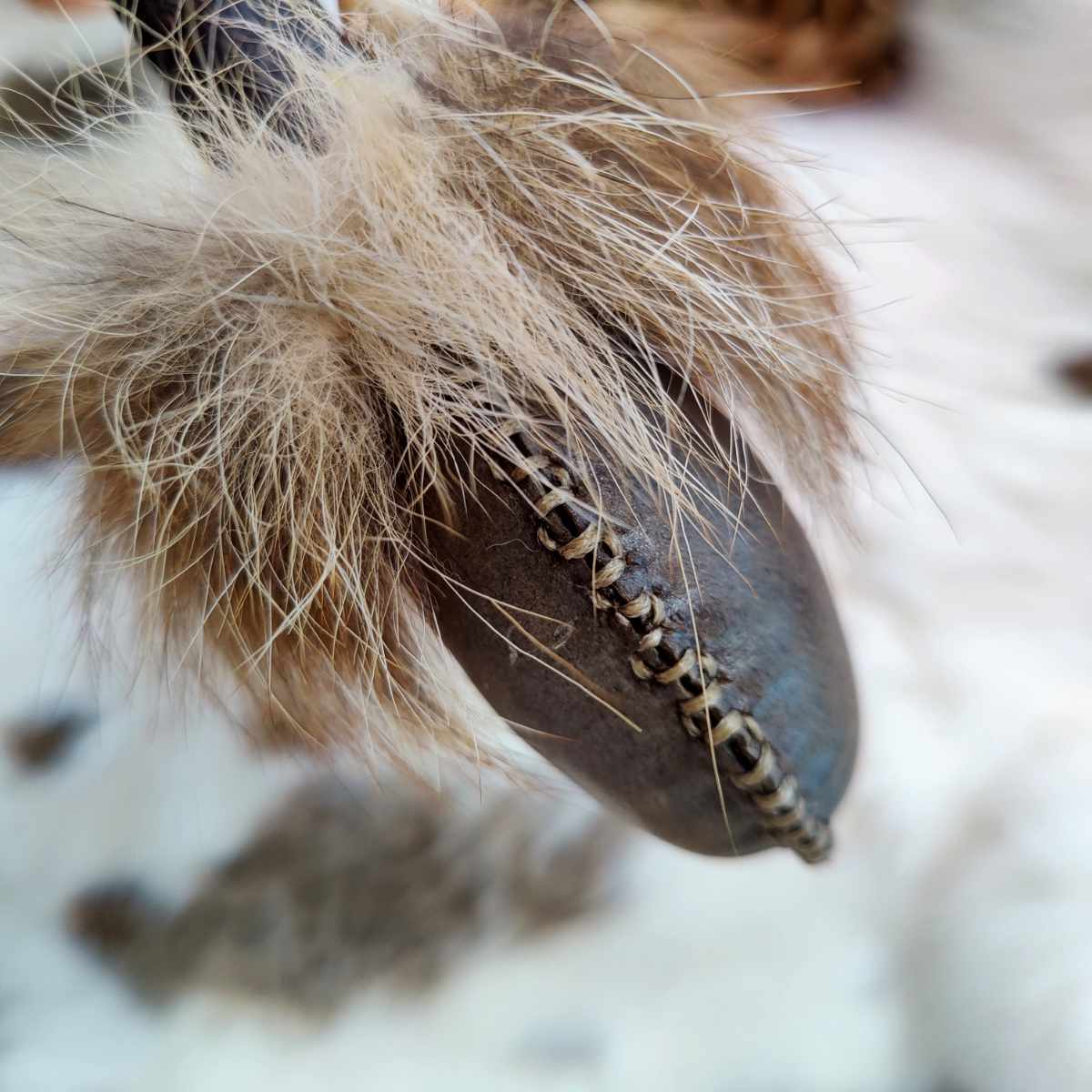Diese kleine Rassel trägt die Energie der Berge in sich. In ihr verbinden sich Bisonhaut, Gamsgehörn und das Fell des Fuchses zu einem urigen Klangkörper. Gefüllt mit Bergkristallen bringt sie Klarheit in das, was aufgewühlt wird. Der Ton ist rauh, eher tief und erdig. Kein feines Klingen, sondern ein rhythmisches Rufen. Sie liegt kompakt in der Hand und wirkt wie ein Werkzeug aus alter Zeit. Eine Kaurimuschel schmückt den Griff. Ein stiller Kontrast zur rohen Kraft des Horns.