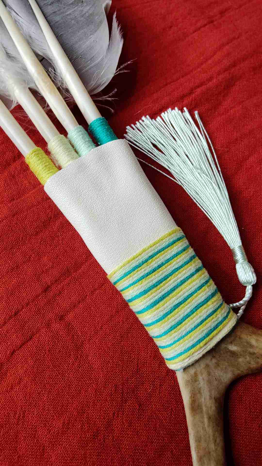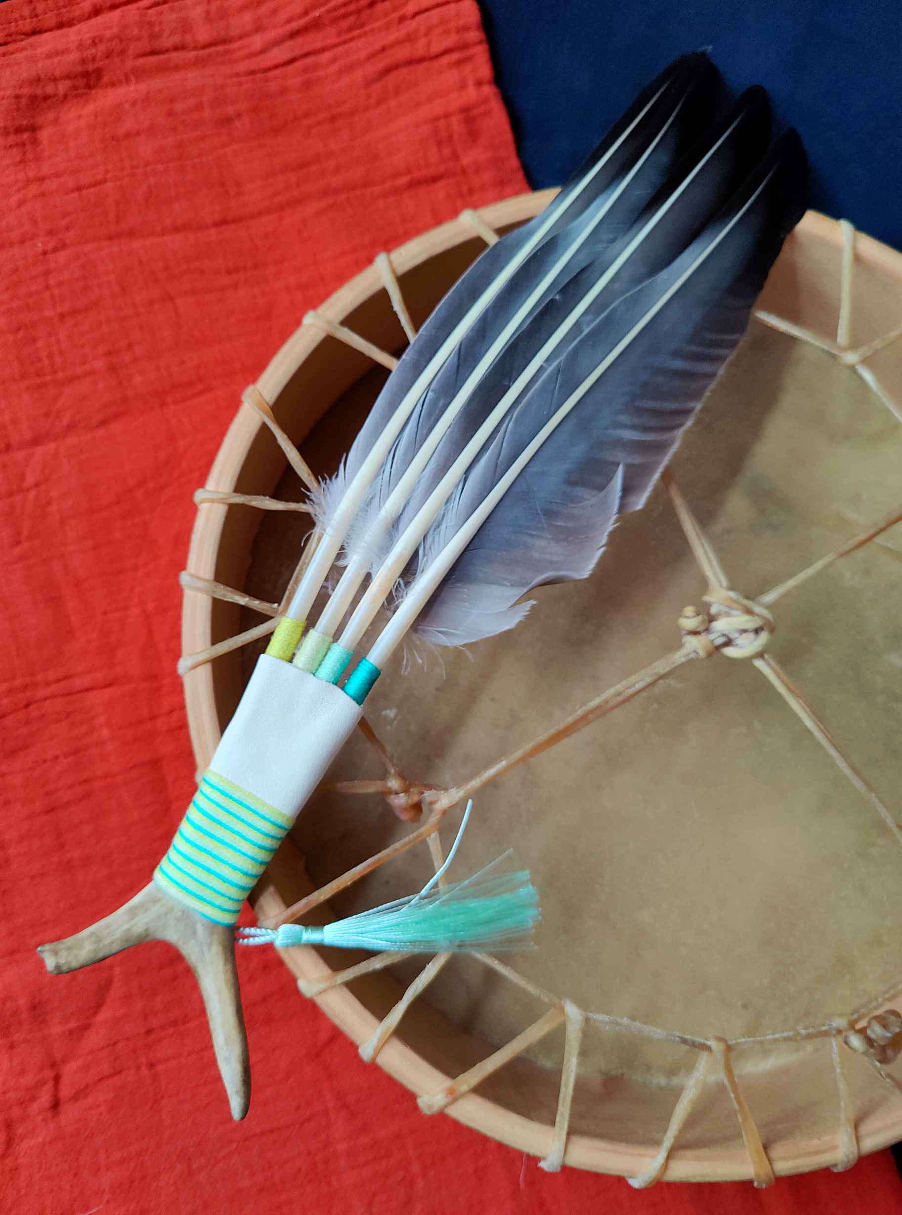 Dieser Fächer trägt die Bewegung des Frühlings in sich. Den ersten Wind, das Erwachen nach dem Stillstand. Die Gänsefedern öffnen Räume für Weite und Durchatmen. Das Griffstück aus Rentiergeweih verankert ihn mit der Erde, während feine Bänder in Türkis, Gelb und Grün den Übergang zur Luft symbolisieren. Eine Quaste schwingt sanft mit im Wind.