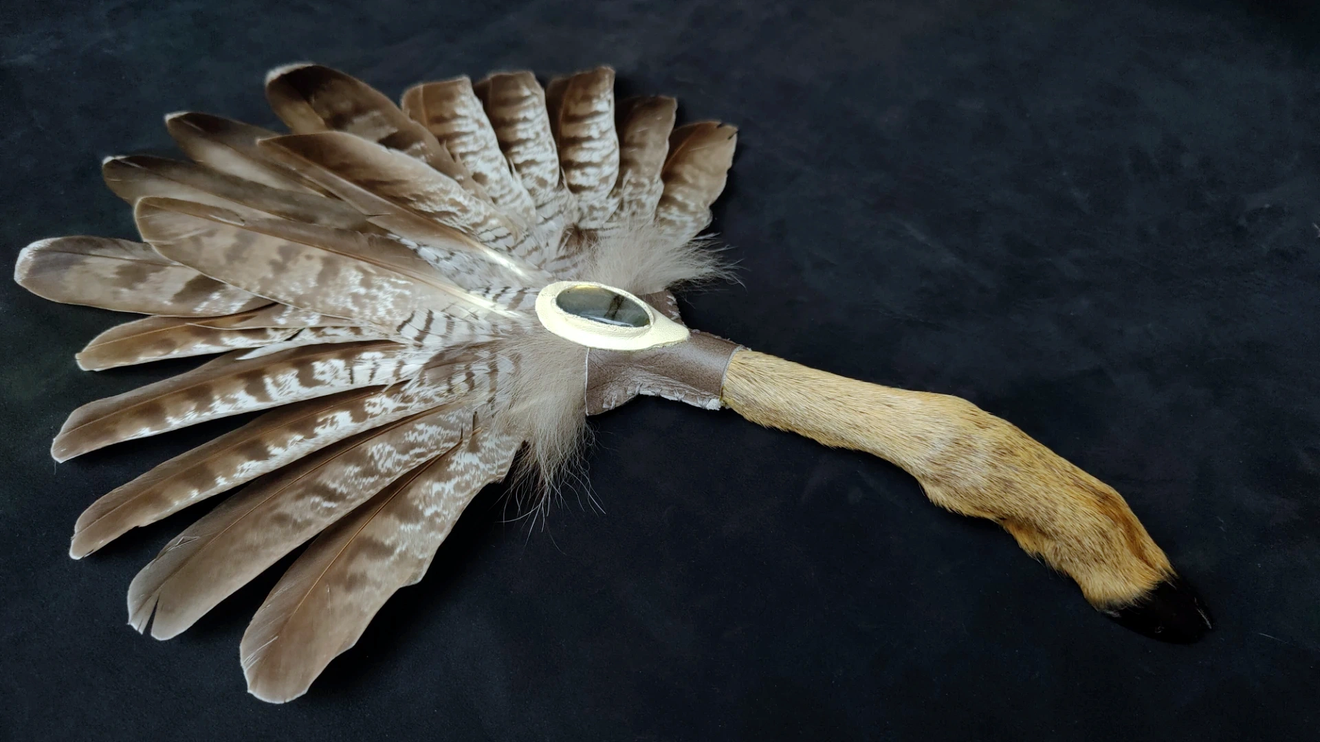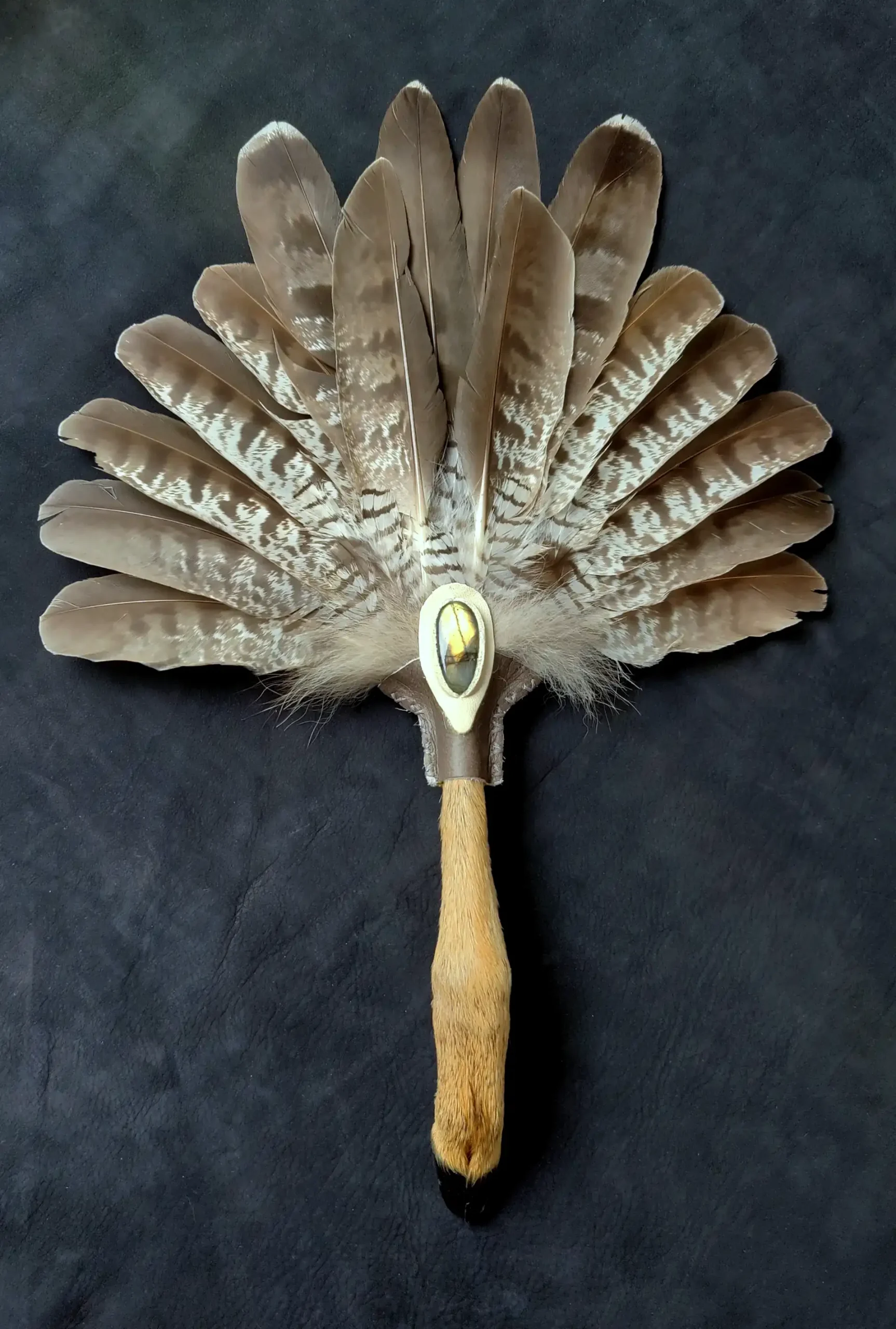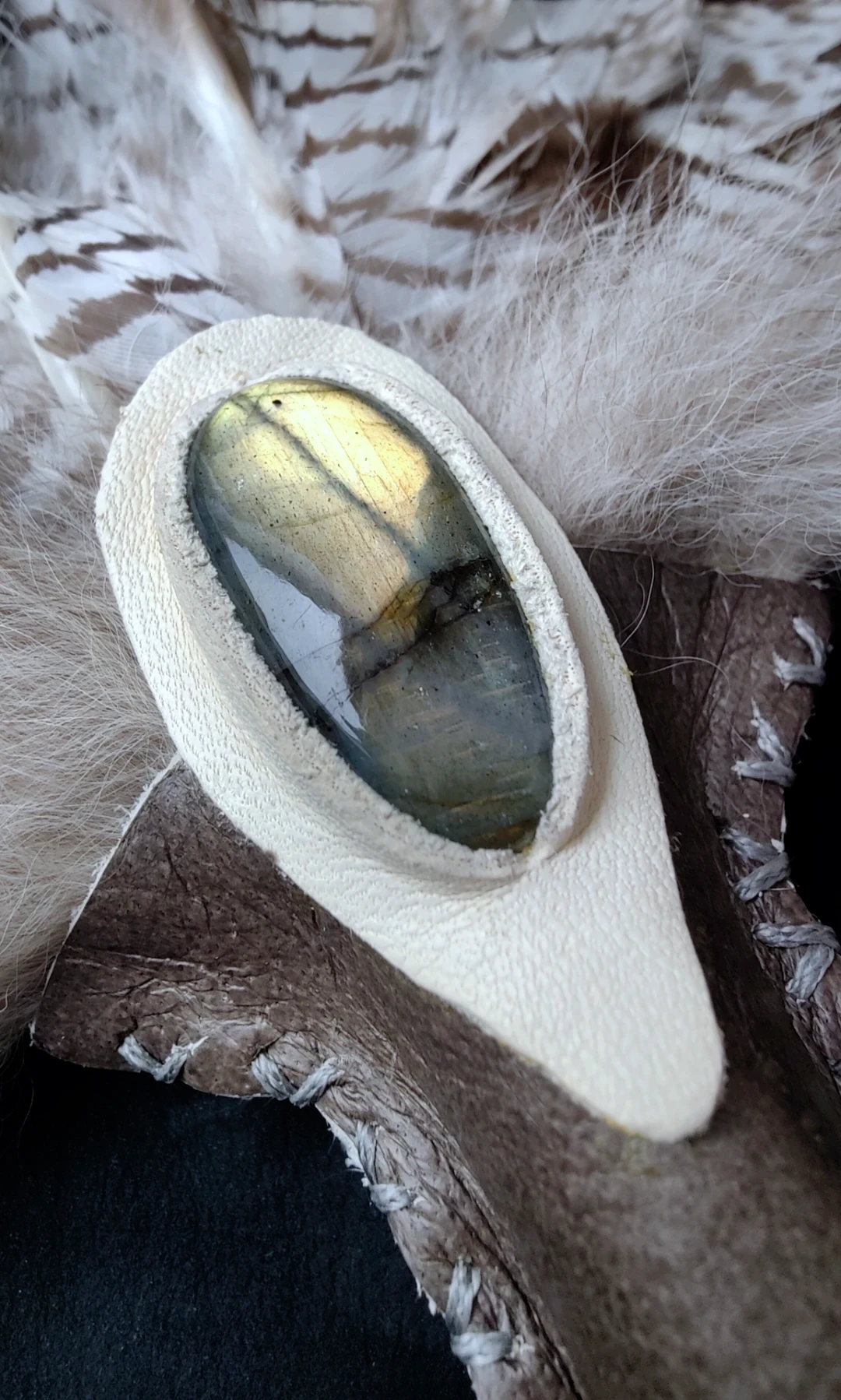 ✦ Materialien: Habichtfedern, Rehbein, Fuchsfell, Labradorit
