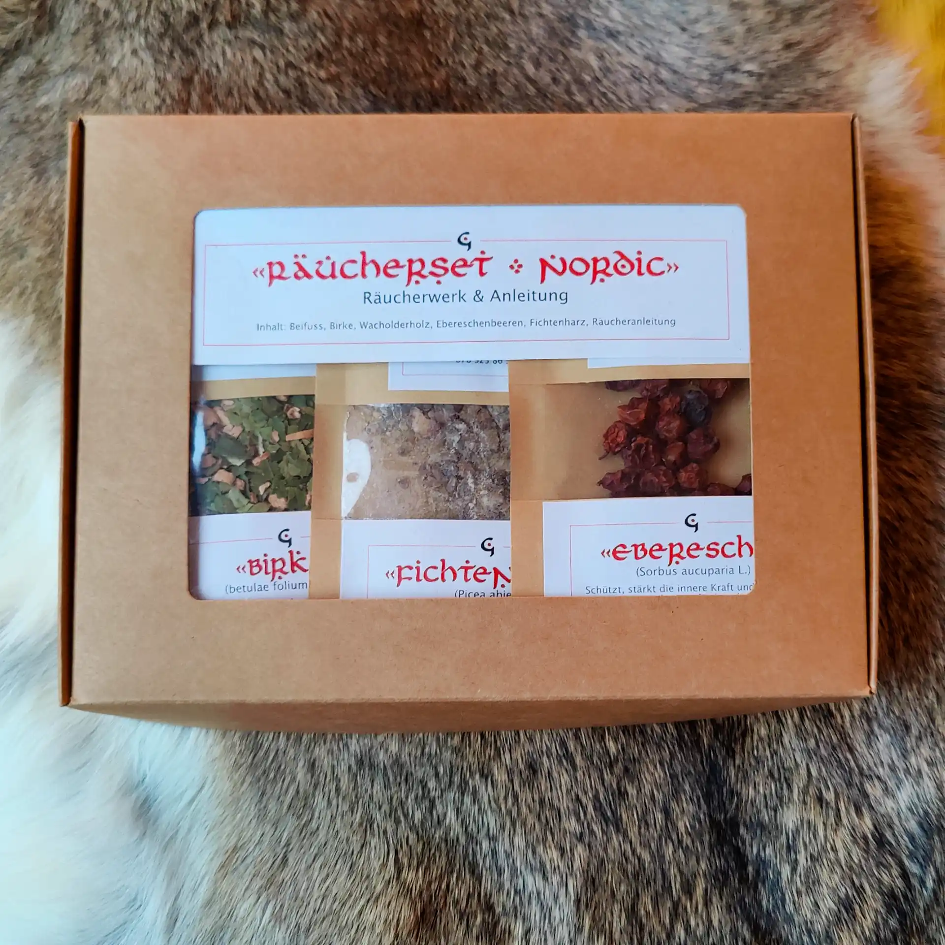 - 5 naturbelassene Räucherstoffe: Beifuss (3 g), Birke (7 g), Wacholderholz (7 g), Ebereschenbeeren (5 g), Fichtenharz (10 g)