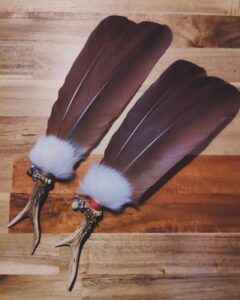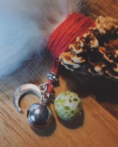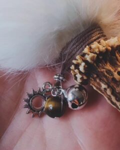 Beide Fächer sind knapp 40 cm lang. Einer ist mit einem Glöckchen, einer Sonne und einer Tigerauge-Perle verziert. Das Tigerauge steht für Klarheit, Schutz und innere Stärke. Es hilft, den Blick für das Wesentliche zu schärfen, negative Einflüße abzuwehren und das Selbstvertrauen zu stärken. Der andere trägt ein Glöckchen, einen Mond und eine Lizardit-Perle. Lizardit wirkt harmonisierend, erdend und fördert die spirituelle Einsicht. Er unterstützt dabei, innere Blockaden zu lösen und einen klaren Zugang zur eigenen Intuition zu finden.